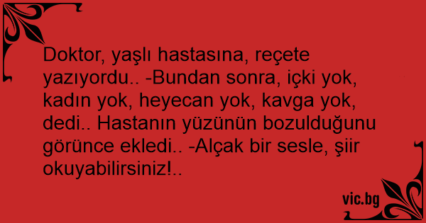 Doktor, yaşlı hastasına, reçete yazıyordu.. -Bundan sonra, içki yok, kadın yok, heyecan yok, kavga yok, dedi.. Hastanın yüzünün bozulduğunu görünce ekledi.. -Alçak bir sesle, şiir okuyabilirsiniz!..