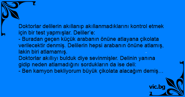 - Buradan geçen küçük arabanın önüne atlayana çikolata verilecektir denmiş. Delilerin hepsi arabanın önüne atlamış, lakin biri atlamamış.