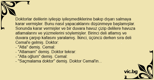 Doktorlar delilerin iyileşip iyileşmediklerine bakıp dışarı salmaya karar vermişler. Bunu nasıl yapacaklarını düşünmeye başlamışlar. Sonunda karar vermişler ve bir duvara havuz çizip delilere havuza atlamalarını ve yüzmelerini söylemişler. Birinci deli atlamış ve duvara çarpıp kafasını yaralamış. İkinci, üçüncü derken sıra deli Cemal'e gelmiş. Doktor: