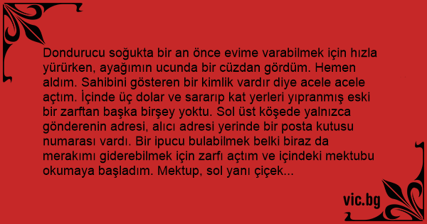 Dondurucu soğukta bir an önce evime varabilmek için hızla yürürken, ayağımın ucunda bir cüzdan gördüm. Hemen aldım. Sahibini gösteren bir kimlik vardır diye acele acele açtım. İçinde üç dolar ve sararıp kat yerleri yıpranmış eski bir zarftan başka birşey yoktu. Sol üst köşede yalnızca gönderenin adresi, alıcı adresi yerinde bir posta kutusu numarası vardı. Bir ipucu bulabilmek belki biraz da merakımı giderebilmek için zarfı açtım ve içindeki mektubu okumaya başladım. Mektup, sol yanı çiçek resmiyle süslenmiş bir kağıda, özenli bir el yazısıyla yazılmıştı ve “Sevgili Michael” diye başlıyordu. Ve “Annesi yasakladığı için onu bir daha göremeyeceğini” anlatarak devam ediyor. “Ama sakın unutma, seni daima seveceğim” diye bitiyor. İmza. Hannah!. Elimde yalnızca, mektubu yazan kişiyle, mektubun yazıldığı kişinin birinci adları vardı. Eve gider gitmez hemen telefon idaresini aradım. Görevli kişi, kendisine bildirdiğim adreste yaşayanların telefon numarasını vermesinin yasalara aykırı olduğunu söyledi. Fakat ısrarım karşısında: