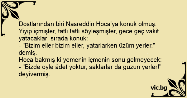 Dostlarından biri Nasreddin Hoca'ya konuk olmuş. Yiyip içmişler, tatlı tatlı söyleşmişler, gece geç vakit yatacakları sırada konuk: