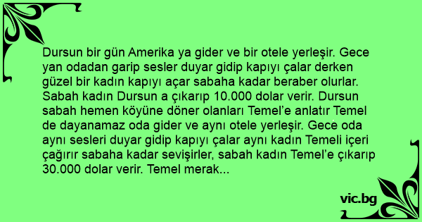 Dursun bir gün Amerika ya gider ve bir otele yerleşir. Gece yan odadan garip sesler duyar gidip kapıyı çalar derken güzel bir kadın kapıyı açar sabaha kadar beraber olurlar. Sabah kadın Dursun a çıkarıp 10.000 dolar verir. Dursun sabah hemen köyüne döner olanları Temel’e anlatır Temel de dayanamaz oda gider ve aynı otele yerleşir. Gece oda aynı sesleri duyar gidip kapıyı çalar aynı kadın Temeli içeri çağırır sabaha kadar sevişirler, sabah kadın Temel’e çıkarıp 30.000 dolar verir. Temel merak eder benim arkadaşımla beraber olduktan sonra ona neden on bin$ verdin de bana daha fazla verdin der. Kadın seninki canlı yayın oldu da onda diye cevap verir.