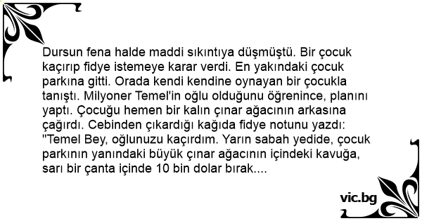 "Temel Bey, oğlunuzu kaçırdım. Yarın sabah yedide, çocuk parkının yanındaki büyük çınar ağacının içindeki kavuğa, sarı bir çanta içinde 10 bin dolar bırak. Dursun!."