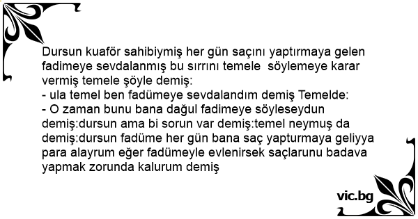 - O zaman bunu bana dağul fadimeye söyleseydun demiş:dursun ama bi sorun var demiş:temel neymuş da demiş:dursun fadüme her gün bana saç yapturmaya geliyya para alayrum eğer fadümeyle evlenirsek saçlarunu badava yapmak zorunda kalurum demiş