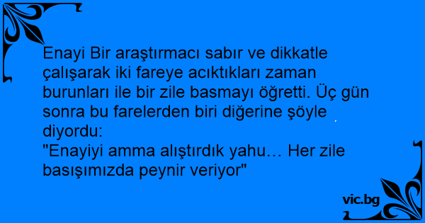 Enayi Bir araştırmacı sabır ve dikkatle çalışarak iki fareye acıktıkları zaman burunları ile bir zile basmayı öğretti. Üç gün sonra bu farelerden biri diğerine şöyle diyordu: