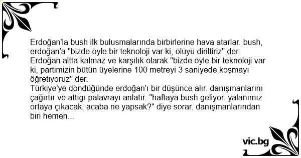 Erdoğan'la bush ilk bulusmalarında birbirlerine hava atarlar. bush, erdoğan'a "bizde öyle bir teknoloji var ki, ölüyü diriltiriz" der.
