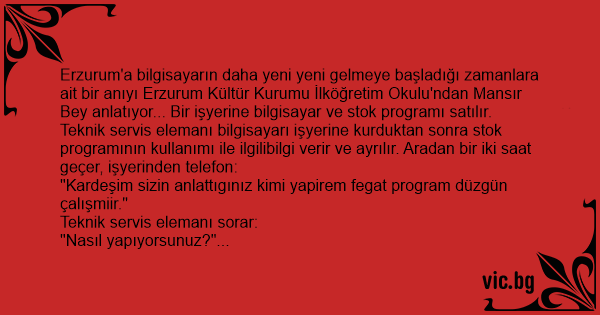 Erzurum'a bilgisayarın daha yeni yeni gelmeye başladığı zamanlara ait bir anıyı Erzurum Kültür Kurumu İlköğretim Okulu'ndan Mansır Bey anlatıyor... Bir işyerine bilgisayar ve stok programı satılır. Teknik servis elemanı bilgisayarı işyerine kurduktan sonra stok programının kullanımı ile ilgilibilgi verir ve ayrılır. Aradan bir iki saat geçer, işyerinden telefon: