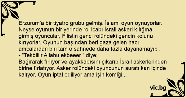 Erzurum’a bir tiyatro grubu gelmiş. İslami oyun oynuyorlar. Neyse oyunun bir yerinde rol icabı İsrail askeri kılığına girmiş oyuncular, Filistin genci rolündeki gencin kolunu kırıyorlar. Oyunun başından beri gaza gelen hacı amcalardan biri tam o sahnede daha fazla dayanamayıp :
