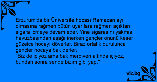 Erzurum'da bir Üniversite hocası Ramazan ayı olmasına rağmen bütün uyarılara rağmen açıktan sigara içmeye devam eder. Yine sigarasını yakmış havuzbaşından aşağı inerken gençler önünü keser güzelce hocayı döverler. Biraz ortalık durulunca gençler hocaya bak derler: