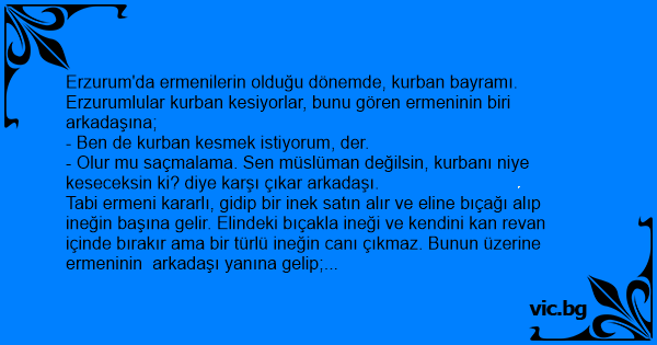 - Olur mu saçmalama. Sen müslüman değilsin, kurbanı niye keseceksin ki? diye karşı çıkar arkadaşı.
