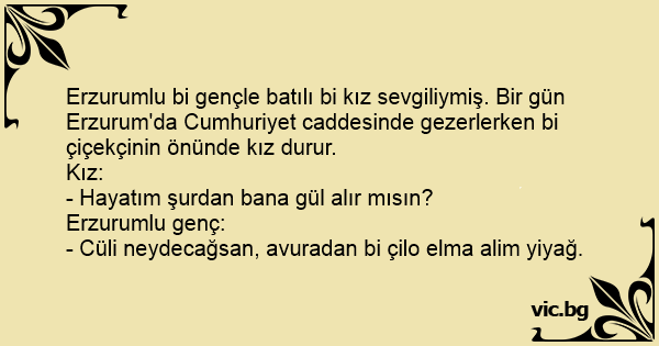 Erzurumlu bi gençle batılı bi kız sevgiliymiş. Bir gün Erzurum'da Cumhuriyet caddesinde gezerlerken bi çiçekçinin önünde kız durur.