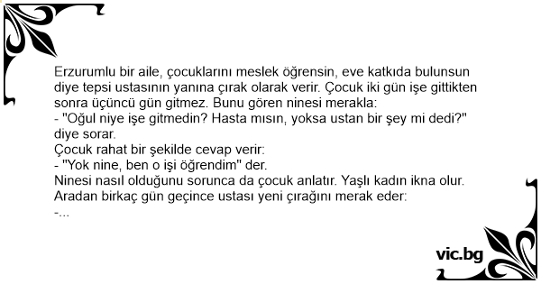 - "Oğlum, bizim uşak tepsi yapmayı öğrenmiş. Bana da anlattı, ben de öğrendim. Gerçekten çok kolaymış" deyince usta şaşırır: