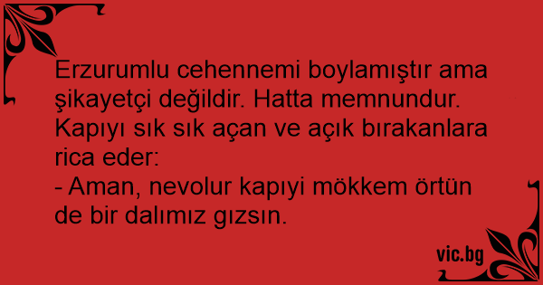 Erzurumlu cehennemi boylamıştır ama şikayetçi değildir. Hatta memnundur. Kapıyı sık sık açan ve açık bırakanlara rica eder: