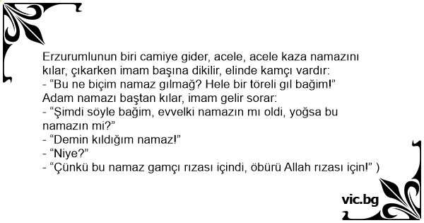 Erzurumlunun biri camiye gider, acele, acele kaza namazını kılar, çıkarken imam başına dikilir, elinde kamçı vardır: