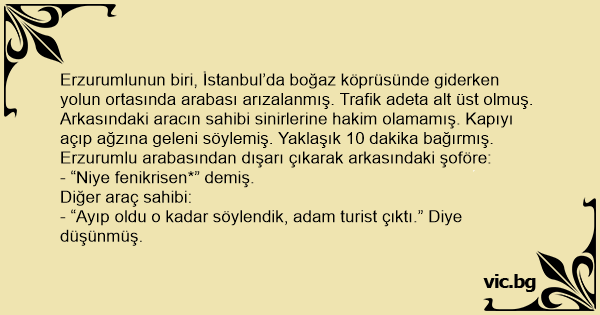 Erzurumlunun biri, İstanbul’da boğaz köprüsünde giderken yolun ortasında arabası arızalanmış. Trafik adeta alt üst olmuş. Arkasındaki aracın sahibi sinirlerine hakim olamamış. Kapıyı açıp ağzına geleni söylemiş. Yaklaşık 10 dakika bağırmış. Erzurumlu arabasından dışarı çıkarak arkasındaki şoföre: