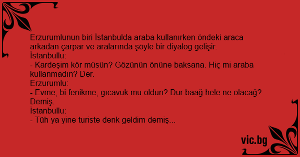 Erzurumlunun biri İstanbulda araba kullanırken öndeki araca arkadan çarpar ve aralarında şöyle bir diyalog gelişir.