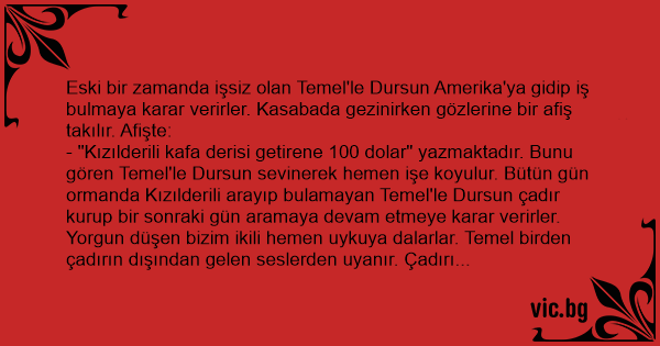 - "Kızılderili kafa derisi getirene 100 dolar" yazmaktadır. Bunu gören Temel'le Dursun sevinerek hemen işe koyulur. Bütün gün ormanda Kızılderili arayıp bulamayan Temel'le Dursun çadır kurup bir sonraki gün aramaya devam etmeye karar verirler. Yorgun düşen bizim ikili hemen uykuya dalarlar. Temel birden çadırın dışından gelen seslerden uyanır. Çadırı aralayarak dışarı baktığında ne görsün, çadırın etrafını Kızılderililer sarmıştır. Hemen Dursun'u uyandırır Ve der ki: