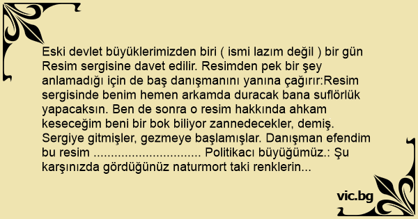 Eski devlet büyüklerimizden biri ( ismi lazım değil ) bir gün Resim sergisine davet edilir. Resimden pek bir şey anlamadığı için de baş danışmanını yanına çağırır:Resim sergisinde benim hemen arkamda duracak bana suflörlük yapacaksın. Ben de sonra o resim hakkında ahkam keseceğim beni bir bok biliyor zannedecekler, demiş.