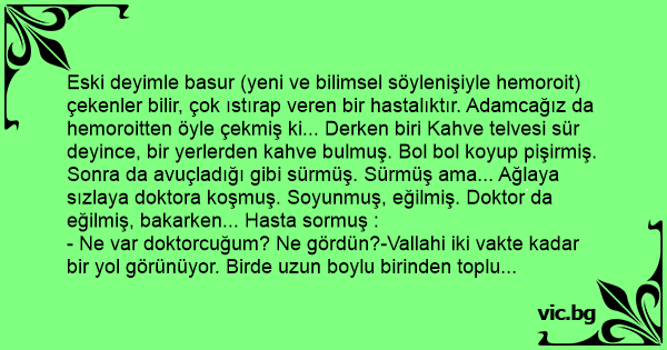 Eski deyimle basur (yeni ve bilimsel söylenişiyle hemoroit) çekenler bilir, çok ıstırap veren bir hastalıktır. Adamcağız da hemoroitten öyle çekmiş ki... Derken biri Kahve telvesi sür deyince, bir yerlerden kahve bulmuş. Bol bol koyup pişirmiş. Sonra da avuçladığı gibi sürmüş. Sürmüş ama... Ağlaya sızlaya doktora koşmuş. Soyunmuş, eğilmiş. Doktor da eğilmiş, bakarken... Hasta sormuş :