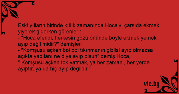 - "Hoca efendi, herkesin gözü önünde böyle ekmek yemek ayıp değil midir?" demişler.