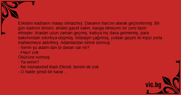 Eskiden kadıların maaşı olmazmış. Davanın harcını alarak geçinirlermiş. Bir gün kadının birisini, ahalisi gayet sakin, kavga etmeyen bir yere tayin etmişler. Aradan uzun zaman geçmiş, kadıya hiç dava gelmemiş, para bakımından sıkıntıya düşmüş. Mübaşiri çağırmış, yoldan geçen iki kişiyi zorla mahkemeye aldırtmış. Adamlardan birine sormuş: