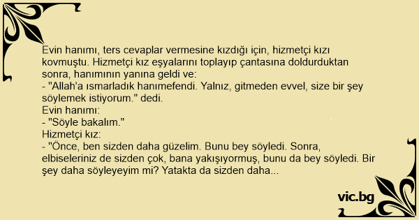 Evin hanımı, ters cevaplar vermesine kızdığı için, hizmetçi kızı kovmuştu. Hizmetçi kız eşyalarını toplayıp çantasına doldurduktan sonra, hanımının yanına geldi ve: