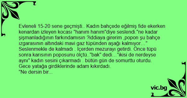 Evleneli 15-20 sene geçmişti.. Kadın bahçede eğilmiş fide ekerken kenardan izleyen kocası "hanım hanım"diye seslendi."ne kadar şişmanladığının farkındamısın ?iddiaya girerim ,popon şu bahçe ızgarasının altındaki mavi gaz tüpünden aşağı kalmıyor…"