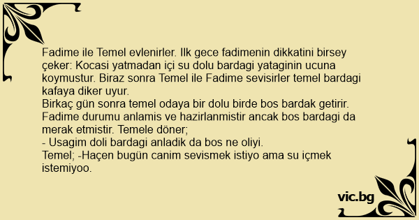 Fadime ile Temel evlenirler. Ilk gece fadimenin dikkatini birsey çeker: Kocasi yatmadan içi su dolu bardagi yataginin ucuna koymustur. Biraz sonra Temel ile Fadime sevisirler temel bardagi kafaya diker uyur.