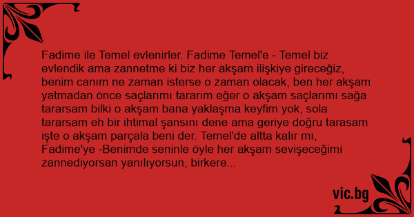 Fadime ile Temel evlenirler. Fadime Temel'e - Temel biz evlendik ama zannetme ki biz her akşam ilişkiye gireceğiz, benim canım ne zaman isterse o zaman olacak, ben her akşam yatmadan önce saçlarımı tararım eğer o akşam saçlarımı sağa tararsam bilki o akşam bana yaklaşma keyfim yok, sola tararsam eh bir ihtimal şansını dene ama geriye doğru tarasam işte o akşam parçala beni der. Temel'de altta kalır mı, Fadime'ye -Benimde seninle öyle her akşam sevişeceğimi zannediyorsan yanılıyorsun, birkere akşam eve geldiğimde rakı sofram hazır olacak. Ben eğer o akşam 1 tek atarsam bilki o akşam keyfim yok zaten sana dokunmam 2 tek atarsam bir ihtimal olabilir amaa üçüncüyü atarsam saçının şekline mekline bakmam kolla kendini derim.