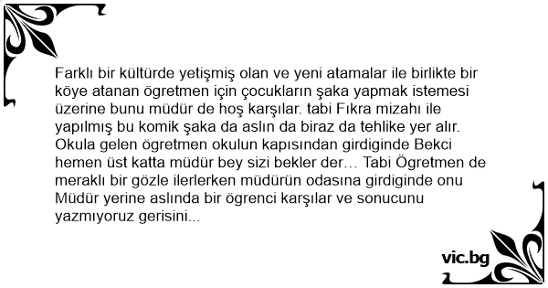 Farklı bir kültürde yetişmiş olan ve yeni atamalar ile birlikte bir köye atanan ögretmen için çocukların şaka yapmak istemesi üzerine bunu müdür de hoş karşılar. tabi Fıkra mizahı ile yapılmış bu komik şaka da aslın da biraz da tehlike yer alır.