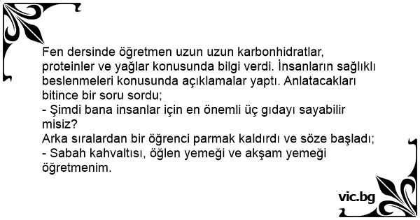 Fen dersinde öğretmen uzun uzun karbonhidratlar, proteinler ve yağlar konusunda bilgi verdi. İnsanların sağlıklı beslenmeleri konusunda açıklamalar yaptı. Anlatacakları bitince bir soru sordu;