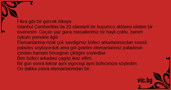 Elemanlarima rizeli çok sevdigimiz büfeci arkadasimizdan sosisli patades söylüyorduk ama gel gelelim elemanlarimiz patadesin içinden hamam böceginin çiktigini söylediler.