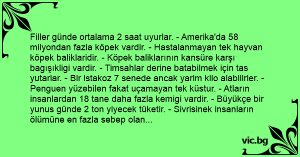 Filler günde ortalama 2 saat uyurlar. - Amerika'da 58 milyondan fazla köpek vardir. - Hastalanmayan tek hayvan köpek baliklaridir. - Köpek baliklarının kansüre karşı bagışıkligi vardir. - Timsahlar derine batabilmek için tas yutarlar. - Bir istakoz 7 senede ancak yarim kilo alabilirler. - Penguen yüzebilen fakat uçamayan tek küstur. - Atların insanlardan 18 tane daha fazla kemigi vardir. - Büyükçe bir yunus günde 2 ton yiyecek tüketir. - Sivrisinek insanların ölümüne en fazla sebep olan hayvandir. - Bir inek hayatı boyunca yaklaşık 200. 000 bardak süt üretir. - Mavi balinanin agirligi 22 ayda 26 tona kadar ulasir. - En hızlı büyüyen hayvan mavi balinadir. - Bir karinca kendi agirliginin 50 kati agirligi kaldırabilir. - En hızlı kara hayvani çitadir. Hizi saatte 95 km'ye ulasabilir. - En hızlı balik yelken balığıdir. Hizi saatte 109 km'ye ulasabilir. - En hızlı kus bogazli kirlangiçtir. Hizi 3 saniyede saatte 128 km'ye çikabilir. - Mavi balinanin çikardiği ses 850 km öteden duyulur. - Mavi yunusların kalbi dakikada sadece 9 kere atar. - Suaygirlari su altında dogar ve dogar dogmaz yüzebilirler. - Hayvanlar alaminde sadece domuzlar günesten yanabilir. - Suaygirlari agizlarını 120 cm açabilirler. - Bir pire kendi boyunun 150 kati yükseklige ziplayabilir. - Son 4000 sene içinde herhangi bir yeni hayvan evcillesmemistir. - Karincaların koku alma kabiliyeti en az köpekler kadar gelismistir. - Insanlari parmak izinden, köpekleri ise burun izinden tanimak mümkündür. - aynı parmak izi gibi her insanin dil izi de farklidir. - Hİmamböcekleri yaklaşık 250 milyon yildir hiçbir degişime ugrİmamıslardir. - Balinanin derialtı yagindan sabun, güzellik kremi, margarin elde edilir. - Vampir yarasaları hayvanların kanini emer ve günde 1 çorba kasigi kanla doyar. - BilgisaYaşlı uğraşmak gözleri bozmaz, sadece yorar. - Dünyadaki işi 1900 yılından itibaren 0, 7 derece artti. - Yunusların beyni insanlarınkinden büyüktür. - Yanlis dereceli gözlük gözü bozmaz. - Insan, ömrü boyunca 20 kg toz yutar. - Kibrit kutusu kadar bir altın, bir tenis kortu büyüklügüne kadar inceltilebilir. - Peru'da hiç umumi tuvalet yoktur. - 600 tane bitki cinsi etyiyendir. - 60 yaşında, insanlar tat alma duyularının %50'sini kaybederler. - El tirnaklari ayak tirnaklarından 4 kaç daha hızlı büyürler. - Gülmek için 17, surat asmak için 43 adaleye ihtiyaç vardir. - Beynin %85'i sudur. - Dünyada en çok kullanılan isim Muhammed'dir. - Eskimolar buzdolaplarını yiyeceklerin dolmamasi için kullanırlar. - Fare bir deveden bile daha fazla süre susuz kalabilir. - Kendi dirseğini yalamanin imkansiz olduğunu - Ördeğin vakvaklamasının yankı yaratmadığını ve bunu kimsenin açıklayamadığını ? - Yaşamın boyunca uyku sırasında yaklaşık 70 böcek ve 10 örümcek yiyecegini - İdrarın zifiri kıranlıkta parladığını ? - Eğer çok şiddetli hapsirirsan, kaburgalarından birini kirabilecegini ? - Hapsirmayi engellemeye çalışırsan, başındaki veya boynundaki damarlardan birinin yirtilabilecegini ve olebilecegini ? - Hapşırdığın sırada gözlerını açık tutmaya calışırsan, yerlerinden fırlayabileceklerini ? - Domuzların vucut yapılarından dolayı hiçbir zaman başlarını yukarı kaldırıp gökyüzüne bakamadıklarını? - Dünya nufusunun %50 sinin hiç telefonla konuşmadığını ? - Farelerin ve atların kusamadıklarını ? - 1 saat suşöyle kulaklikla birşey dinlemenin kulaktaki bakteri sayisini %700 arttirdiğini ? - Çakmagin kibritten önce bulunduğunu ? - Parmak izleri gibi dil izlerinin de her insan için benzersiz olduğunu ? - bu yazıyı okuyan insanların %75 inden fazlasinin, dirseklerini yalamaya çalışacaklarını - Hapşırdığınız Zaman Kalbinizde Dahil Olmak üzere Bütün Vücut Fonksiyonlarınız Bir An İçin Durur. - Filler Zıplayamayan Tek Memelilerdir. - Zürafaların Ses Telleri Yoktur. - Zürafalar 35 Cm Uzunluğunda Siyah Bir Dile Sahiptirler. - Kangurular Geri Geri Yürüyemezler. - Kelebekler Ayaklarıyla Tat Alırlar. - Kadınlar Erkeklere aranla 2 kaç Fazla Göz Kırpar. - İnsan Vücudundaki En Güçlü kaç Dildir.