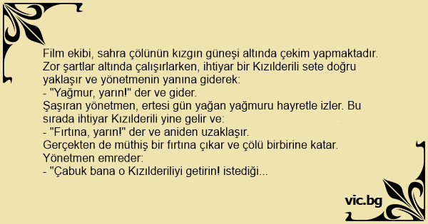 - "Nasıl olsa geçer." diye düşünerek beklemeye başlar. 1 gün, 2 gün, 1 hafta, 1 ay derken yönetmenin sabrı taşar ve Kızılderiliyi bir kenara çekerek öfkeyle sorar: