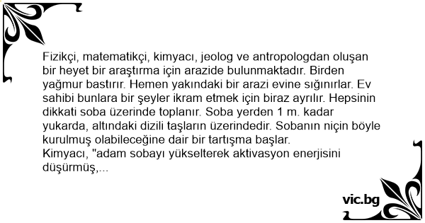 Fizikçi, matematikçi, kimyacı, jeolog ve antropologdan oluşan bir heyet bir araştırma için arazide bulunmaktadır. Birden yağmur bastırır. Hemen yakındaki bir arazi evine sığınırlar. Ev sahibi bunlara bir şeyler ikram etmek için biraz ayrılır. Hepsinin dikkati soba üzerinde toplanır. Soba yerden 1 m. kadar yukarda, altındaki dizili taşların üzerindedir. Sobanın niçin böyle kurulmuş olabileceğine dair bir tartışma başlar.