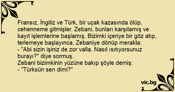 Fransız, İngiliz ve Türk, bir uçak kazasında ölüp, cehenneme gitmişler. Zebani, bunları karşılamış ve kayıt işlemlerine başlamış. Bizimki içeriye bir göz atıp, terlemeye başlayınca, Zebaniye dönüp merakla: