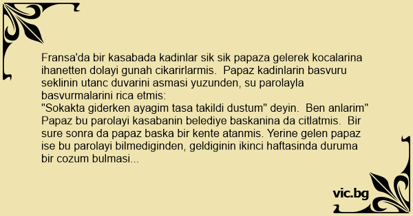 Fransa'da bir kasabada kadinlar sik sik papaza gelerek kocalarina ihanetten dolayi gunah cikarirlarmis. Papaz kadinlarin basvuru seklinin utanc duvarini asmasi yuzunden, su parolayla basvurmalarini rica etmis: