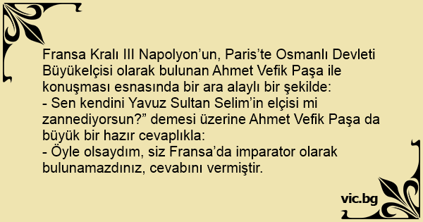 - Sen kendini Yavuz Sultan Selim’in elçisi mi zannediyorsun?” demesi üzerine Ahmet Vefik Paşa da büyük bir hazır cevaplıkla: