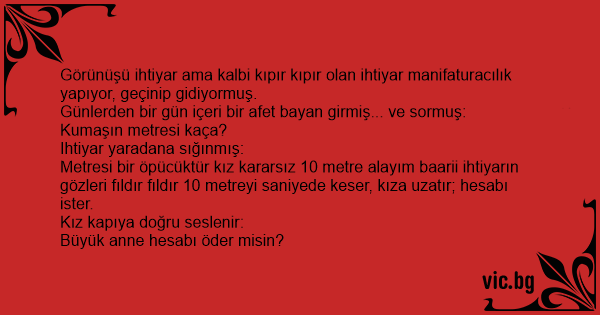 Metresi bir öpücüktür kız kararsız 10 metre alayım baarii ihtiyarın gözleri fıldır fıldır 10 metreyi saniyede keser, kıza uzatır; hesabı ister.
