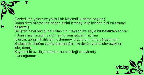 Istersin, zenginlik dilersin, evlenmeyi arzularsın, ama uğraşamam. Sadece bir dileğini yerine getireceğim. İyi düşün ve ne isteyeceksen iste, demiş.