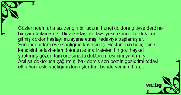 Sonunda adam eski sağlığına kavuşmuş. Hastanenin bahçesine kendisini tedavi eden dotorun adına izafeten bir göz heykeli yaptırmış gözün tam ortasınada doktorun resimini yaptırmış.