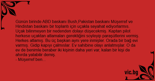 Günün birinde ABD baskanı Bush,Pakistan baskanı Müşerref ve Hindistan baskanı bir toplantı için uçakla seyahat ediyorlarmıs. Uçak bilinmeyen bir nedenden dolayı düşecekmiş. Kaptan pilot herkese uçaktan atlamaları gerektiğini soyleyip paraşütlerini vermiş. Herkes atlamış. Bu üç başkan aynı yere inmişler. Orada bir bağ evi varmış. Gidip kapıyı çalmıslar. Ev sahibine olayı anlatmışlar. O da ev de benimle beraber iki kişinin daha yeri var, kalan bir kişi de ahırda yatabilir demiş.