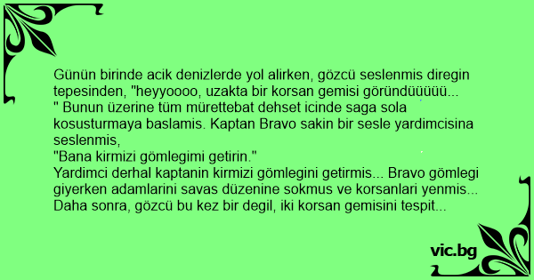 Günün birinde acik denizlerde yol alirken, gözcü seslenmis diregin tepesinden, "heyyoooo, uzakta bir korsan gemisi göründüüüüü...