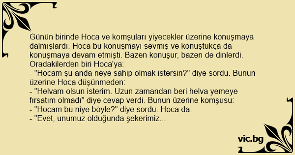 - "Helvam olsun isterim. Uzun zamandan beri helva yemeye fırsatım olmadı" diye cevap verdi. Bunun üzerine komşusu: