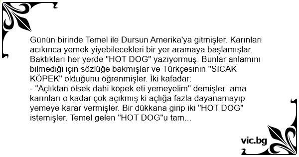 Günün birinde Temel ile Dursun Amerika'ya gitmişler. Karınları acıkınca yemek yiyebilecekleri bir yer aramaya başlamışlar. Baktıkları her yerde "HOT DOG" yazıyormuş. Bunlar anlamını bilmediği için sözlüğe bakmışlar ve Türkçesinin "SICAK KÖPEK" olduğunu öğrenmişler. İki kafadar: