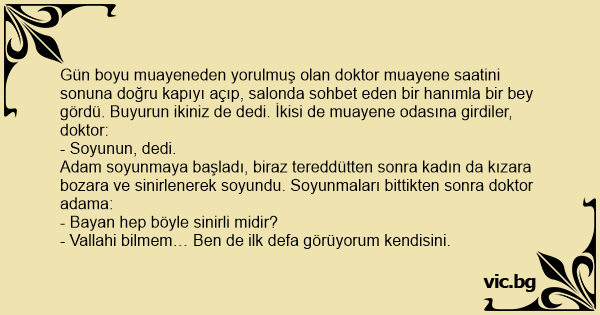 Gün boyu muayeneden yorulmuş olan doktor muayene saatini sonuna doğru kapıyı açıp, salonda sohbet eden bir hanımla bir bey gördü. Buyurun ikiniz de dedi. İkisi de muayene odasına girdiler, doktor: