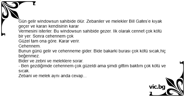 Gün gelir windowsun sahibide ölür. Zebaniler ve melekler Bill Gates’e kıyak geçer ve kararı kendisinin karar