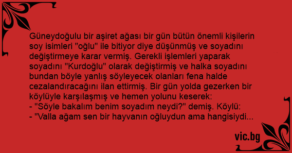 Güneydoğulu bir aşiret ağası bir gün bütün önemli kişilerin soy isimleri "oğlu" ile bitiyor diye düşünmüş ve soyadını değiştirmeye karar vermiş. Gerekli işlemleri yaparak soyadını "Kurdoğlu" olarak değiştirmiş ve halka soyadını bundan böyle yanlış söyleyecek olanları fena halde cezalandıracağını ilan ettirmiş. Bir gün yolda gezerken bir köylüyle karşılaşmış ve hemen yolunu keserek: