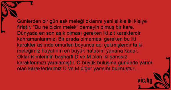 Oklar isimlerinin başharfi D ve M olan iki şanssız karakterimizi yaralamıştır. O büyük buluşma gününde yarım olan karakterlerimiz D ve M diğer yarısını bulmuştur ancak ortada çok büyük bir problem vardır. D ve M daha önce hiç hissetmedikleri ve belki başka hiçbir zaman hissedemeyecekleri güzel şeyler hissetmişlerdir ama bunun sonu olmadığınıan yakınıp durmuşlar bir süre. İki karakterimizde işini gücünü bırakmış, dünyadan ve sorumlu oldukçarı insanlardan bihaber inzivaya çekilmişler. Ancak bu sırada dünya birbirine girmiştir, insanlar çıldırmış, dünya sanki tersine dönmüştür sadece D ve M'nin değil tüm insanların hayatı alt üst olmuştur. Tabii aşkın gözü kördür D ve M'nin bunun farkına varması uzun zaman almıştır bu süre içinde küçük kıyametler kopmuş D ve M ancak dostlarının uyarmasıyla durumun farkına varmışlardır. Kahramanlarımızıan M'nin gözünün önündeki perdeler kalkıp olayın ciddiyetini fark edince D'ye artık ayrılmaları gerektiğini yoksa sadece ikisinin mutlu olması uğruna birçok insanın hayatının kararacağını anlatmıştır. Ancak, D kabullenememiş, bunun mümkün olmayacağını, onsuz hayatın zindanda yaşamaktan farklı olmayacağını anlatmış durmuştur, fakat M kafasına koymuştur bir kere ayrılmalarının en doğru karar olacağını söylemiş, bırakıp gitmiştir D'yi. O günden sonra D ve M hiç arİmamış, solmamışlar birbirlerini. Ama ne D mutludur ne de M. İkiside kendilerini görevlerine adamış hep başkaları için çalışmıştır, ne bir başkasına gönül verebilmişler ne de yaşadıkları o güzel günleri unutabilmişlerdir. D hiçbir zaman yedirememiştir, anlamamamıştır sevdiğini. Ama gururunu yenipte gidememiştir M'ye. M hep bu kaçırın en doğru karar olduğunu düşünmüş ama yürekten inanİmamıştır buna sadeceşöyle yapması gerektiği için yapmıştır, mutsuzdur ama yapılabiçecek başka bir şey yoktur. O günden sonra D ve M aynı yerde buluİmamak için çok çabalamışlardır. Aslında çoğu zaman buluşmuşlar mecburiyetten her buluşmada küçük kıyametler kopmuş, insanlar üzülmüş, ağlamıştır hatta kimi insanın canına mal olmuştur bu buluşma. Merak ettiniz değilmi bu iki bahtsızın gerçek adını daha fazla meraklandırmayayım sizi. Duygu ve Mantıktır asıl isimleri. Dünyada en son bir araya gelmesi gereken iki geçinemeyen sevgili.