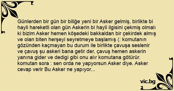 Günlerden bir gün bir biliğe yeni bir Asker gelmiş, birlikte bi hayli hareketli olan gün Askerin bi hayli ilgisini çekmiş olmalı ki bizim Asker hemen köşedeki bakkaldan bir çekirdek almış ve olan biten herşeyi seyretmeye başlamış (: komutanın gözünden kaçmayan bu durum ile birlikte çavuşa seslenir ve çavuş şu askeri bana getir der, çavuş hemen askerin yanına gider ve dedigi gibi onu alır komutana götürür. komutan sora : sen orda ne yapyorsun Asker diye. Asker cevap verir Bu Asker ne yapıyor diye merak ediyorum